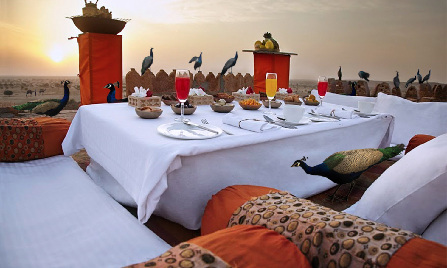 Viaje con nosotros hacia el desierto en la oscuridad antes del amanecer hacia el Fuerte de Khaba. Aqui, en las antiguas ruinas de las murallas del fuerte, se servirá un desayuno con champán para usted junto con un delicioso surtido de pasteles y delicias tradicionales de la India como parathas (pan caliente), kachoris (bola de masa frita) t café recien hecho. Mientras se sienta a desayunar a saborear la comida, el sol lentamente se abre camino hacia el horizonte y las arenas del desvirtuó toman un suave resplandor dorado y la fresca brisa revuelve suavemente el pelo. Y en este momento, comienza el encantamiento.