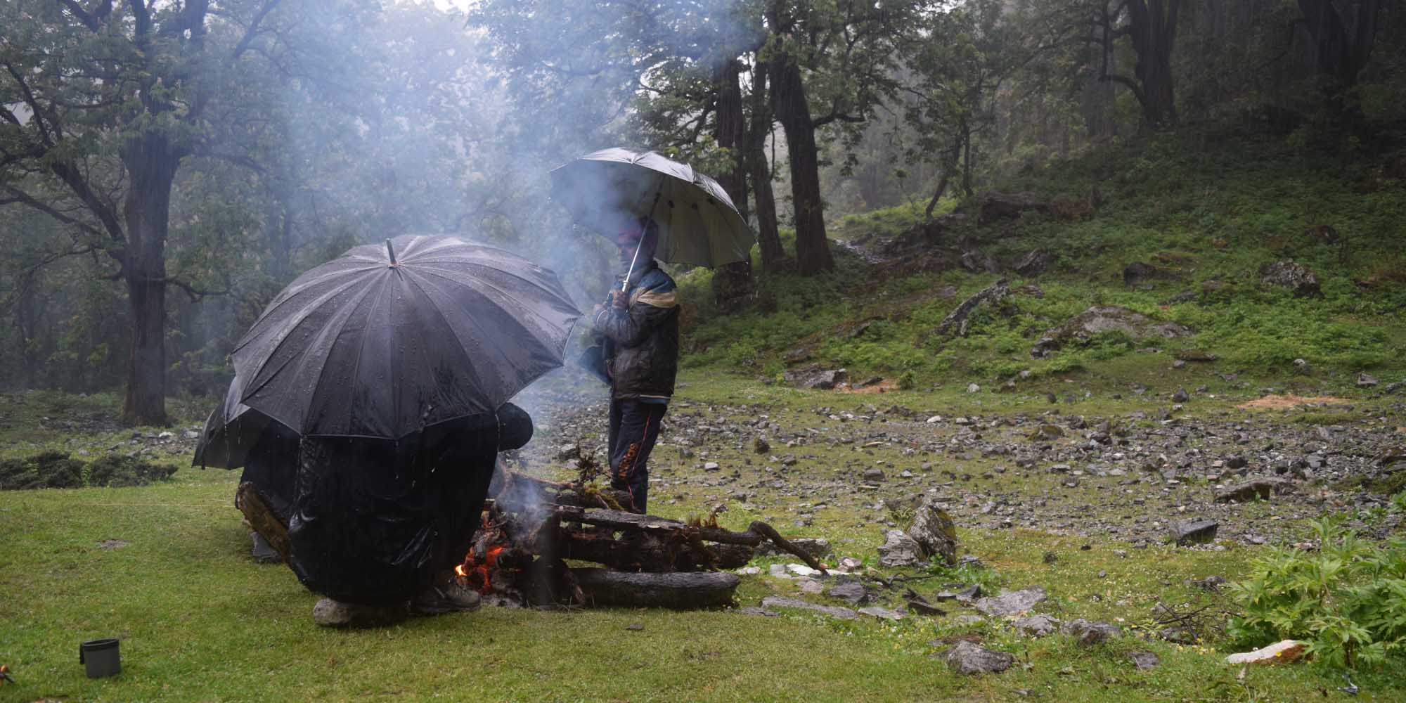The worst, however, was yet to happen. It started raining and we took out our ponchos. It was a steep uphill walk for next 2 gruelling hours, with a steady heavy downpour that refused to let up. Our rucksacks felt heavier, and our shoes never felt wetter. All we did was walk on and on, to avoid the chilling cold overcome us. It felt like the longest day, but we finally arrived at our camping site at Dhakwani from where we could see our final ascent to the Kuari pass. It was a big meadow surrounded by mountains. We changed our clothes while the porters managed to conjure up a fire out of wet logs of wood – a minor feat which city dwellers would not be able to do. We set up our dining and kitchen tent and the cook was quick enough to prepare a masala tea to get us warm.
