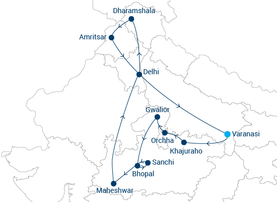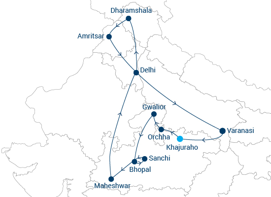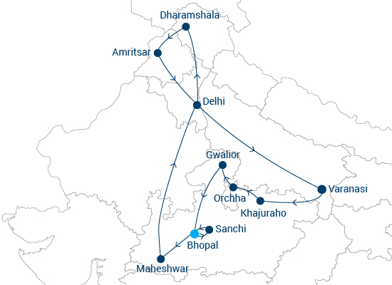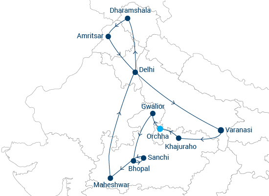 Auf dieser außergewöhnlichen Reise entdecken Sie in 18 Tagen ein reiches Spektrum kultureller, geschichtsträchtiger und spiritueller Aspekte Indiens. Von der geschäftigen Hauptstadt Neu-Delhi bis zur heiteren Gelassenheit von Dharamsala; von der Schönheit des Goldenen Tempels in Amritsar bis zur zeitlos-zauberhaften Abendzeremonie in Varanasi, der ältesten lebenden Stadt der Welt; von den exotischen Tempeln in Khajuraho bis zur melancholischen Schönheit der verlassenen Gedenkstätten von Orchha; von der prächtigen Festung Gwalior bis Bhopal, der Stadt der Seen; von den atemberaubenden Festungen und Palästen in Mandu bis Maheshwar und dem Erbe der Holkar-Herrscher.