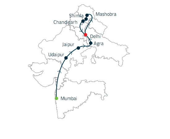 Wenn Sie einige der Highlights im unglaublichen Indien sehen möchten, laden wir Sie ein, eine Welt voller Kontraste in Mumbai zu entdecken, wie ein König in Rajasthan zu leben, sich von der Liebe im Taj zu umgeben, Indiens reiche Geschichte in Delhi zu entdecken und erstaunt zu sein von der spektakulären Aussicht auf die Berge im Norden des Landes.