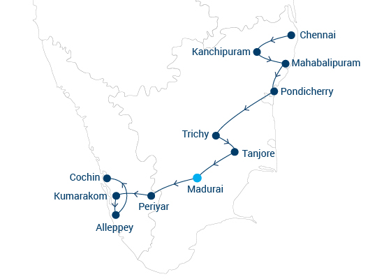 En esta odisea del sur de la India disfrute de un crucero nocturno en una casa flotante en Alleppey y descubra los encantos simples de los remansos escénicos. Pase tiempo en Periyar donde los elefantes salvajes vagan, disfrute de un retiro de spa Ayurveda, descubra la magnífica arquitectura de los templos en Madurai y Tanjore, explore los bungalows de comerciantes ricos en Karaikudi, admire los cientos de caballos de terracota en Ayyanar, enamorarese de la pintoresca ciudad francesa de Pondicherry y obtenga una lección de historia y seda en Chennai. Así que vengan, descubran el maravilloso mundo del sur de la India.