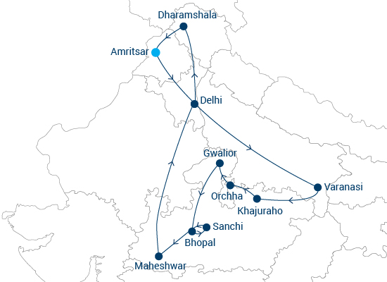 Disfrute de la experiencia de la mezcla cultural, histórica y espiritual de este tour. Desde la bulliciosa capital de Nueva Delhi, la serenidad de Dharmsha, desde la belleza del templo dorado de Amritsar, la ceremonia nocturna a hipnótica y eterna en la ciudad viva más antigua del mundo, Varansi; los templos exóticos de Khajurahoa la belleza la belleza melancólica de los chhatris abandonados de Orchha, la fortaleza magnífica de Gwalior a Bhopal, ciudad de los lagos famosos por sus sitios históricos y arqueológicos, los impresionantes fuertes y palacios de Mandu a Maheshwar hasta la herencia de los gobernantes de Holkar, este viaje es rico, gratificante y verdaderamente extraordinario.